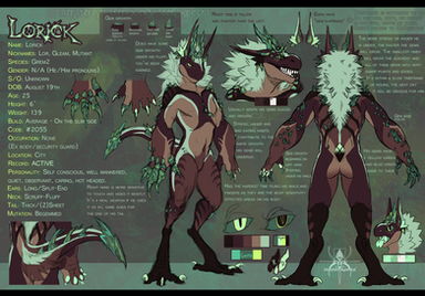 Bio; Commissioned by an entertainment group, a travelling circus/freakshow, Logan was built from the ground up to resemble a monster. This hulking beast of a Grem was created for the sole purpose of entertainment. He filled the role well, netting the company a pretty penny with the headline 'Cypherus Grem - CAPTURED AND DANGEROUS - Come see this freak of science and nature!'. He is not a cypher Grem however, in fact he is completely normal as far as traits go; his gnatted mane of scruff fluff make him look feral and the fluid control of his tail makes it seem like he was spliced with some sort of serpent. None of this is the case, simple acting and a bit of makeup, but hey, that's show biz. Here he is treated more like an asset than an individual but it's all he knows and it's where he stays.