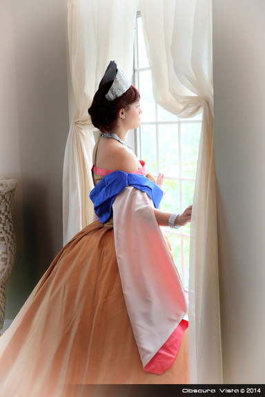 Start to finish I think about 6-7 hours. Cutting that kind of fabric is insane because it's basically ALL sequins on transparent mesh XD and then I had to run it slowly under the machine so I didn't destroy the fabric OR machine! lol Then there was tailoring it to fit just right and make the slit do what I wanted. Good times XD