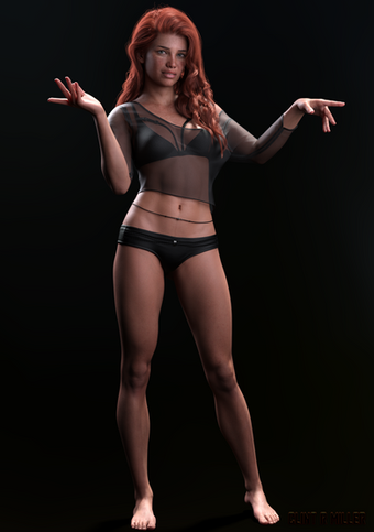 Behind-the-Scenes: This could've been (almost) the final version of Second Generation . I built a garage-like setting around Dawn and Layla with a stereo and speakers, but under this lighting none of it showed up. All it did was create pixel fireflies all over the place, so I took the setting back to a simple black velvet floor and wall. Even so, just by having Dawn and Layla together with clothes on made this into a 14 hour render.