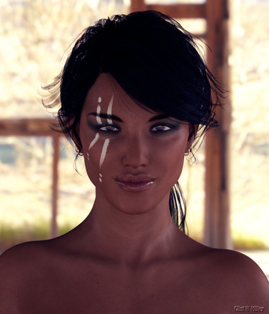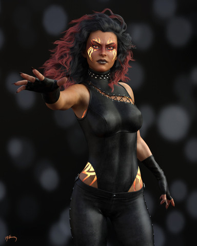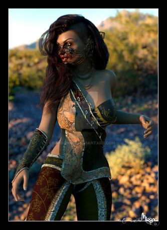 Within the context of her story it originated as warpaint, but by Semiramis' time djinn involved in a certain profession wore it as a sign that they were available for the... rough stuff. It said, "Whatever you can dish out I can take it. Bring it on." Ariadne and Eleni were already part of that lifestyle when Semiramis met them. It was an honorable profession and lifestyle for most djinn, but not the nobility and certainly not for royalty, so getting into it herself - even though she kept it secret - was part of Semiramis' rebelling against her station.