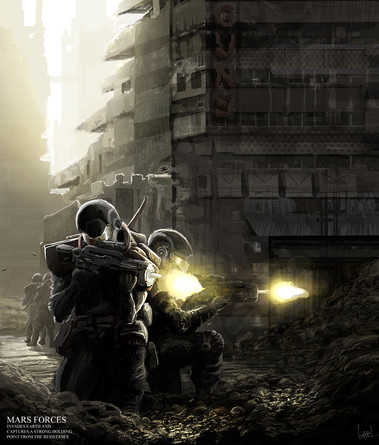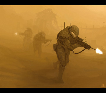 Original Info: "I've been wanting to paint something like this in a while. I know it might seem as if these warriors would die by a heat stroke! Think about it for a sec, have some thoughts about the future. What if these uniforms have some sort of cooling system running underneath? I mean technology is getting smaller by the years, I've read about a new lcd tv thats about 2-3 centimeters thick. I am pretty sure our soldiers in the future will be able to do things like no other