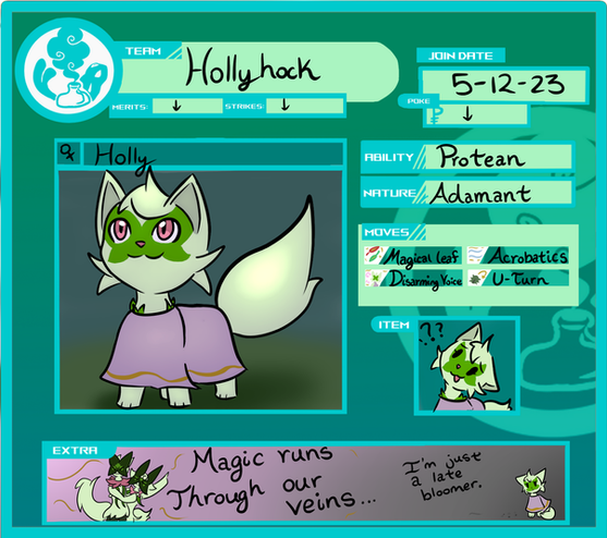 Heth discovered Rima at the Pet Store when he'd first arrived to actually obtain a Drifloon to accompany him in his small hut home. But quickly his mind was changed when little Rima, who had been performing her daily wing therapy, flew into the Skymin's face. As much as the clerks apologized, Heth could do nothing but simply laugh at Rima's behavior. After asking many questions, regarding Rima herself and her condition, Heth decided this was the pet for him, and would not be satisfied leaving the store without her. The clerks were very thankful, and mentioned how they were very worried Rima would be left behind long after her siblings were purchased.