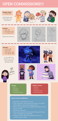 Hello! I'm open for whole body commissions, examples of it are above as you can see.A piece will cost $11. Colors, simple shading and background included. +$1 if you wish to add a character.
