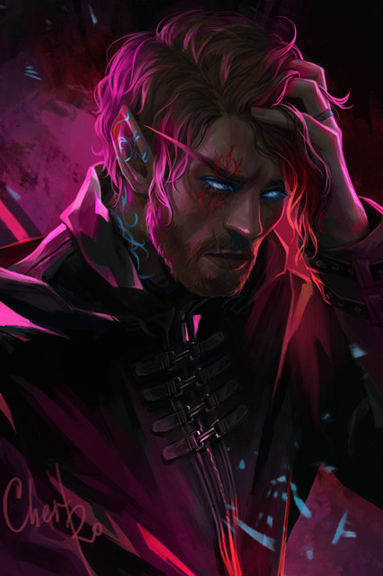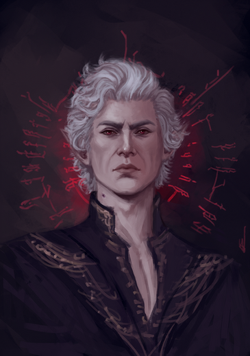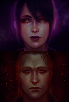 I personally still battle with Solas' character. He's interesting and well written, but somewhat of an egg. I love the different shades you chose for him, the fade green contrasts nicely with the red tones!
