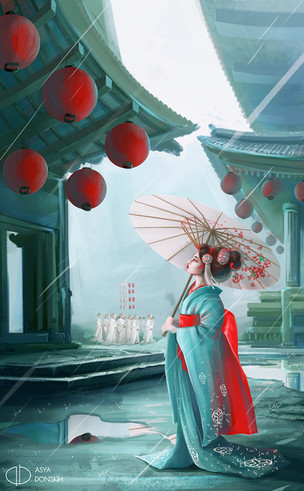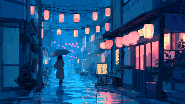 Beautiful picture! Composition, colors, lighting (the blue-gray of the rain, the glow of the lanterns, the drama of the lady in the foreground looking down the alley), all perfect!