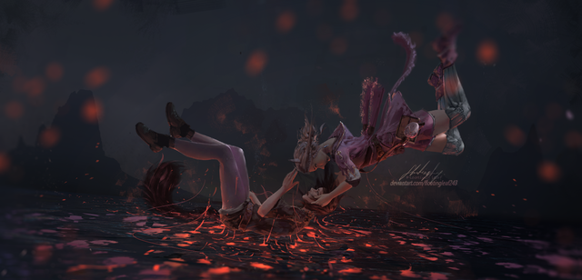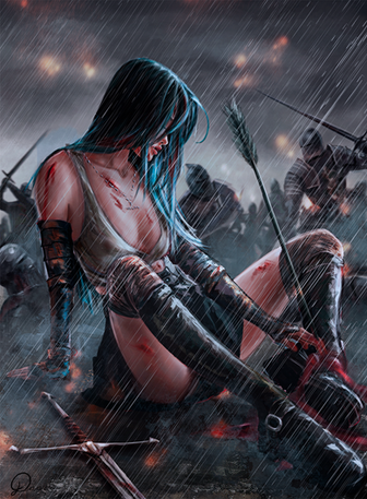 This makes a nice follow-up to, "Duel(Aeolian vs. Lenia)." At first, it looked like Aeolian had the upper hand, but I just noticed that Lenia has her sword to Aeolian's throat... appears this match is a draw. I do like Aeolian's wild, savage looks and unkemptness, her athletic physique, and her sexy, impressive legs. Lenia's legs are equally impressive and sexy. Aeolian also has some very formidable heels and claws... she is quite the wildcat.