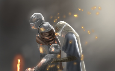 To see the Fire Keeper rest her head against the Ashen One is very beautiful here.Β It seems to suggest the quiet bond they have developed throughout the game.Β They are partners and both ushered in the next Age.Β Both still have work to do, and they'll see to it together.Β The way the Fire Keeper rests her hands tenderly on her dear friend is a wonderful gesture.