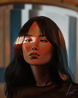 different style, you certainly knows how to make a good use of brushes! i love how abstract her hair and the background are, but her face is so realistic. it's a great contrast.