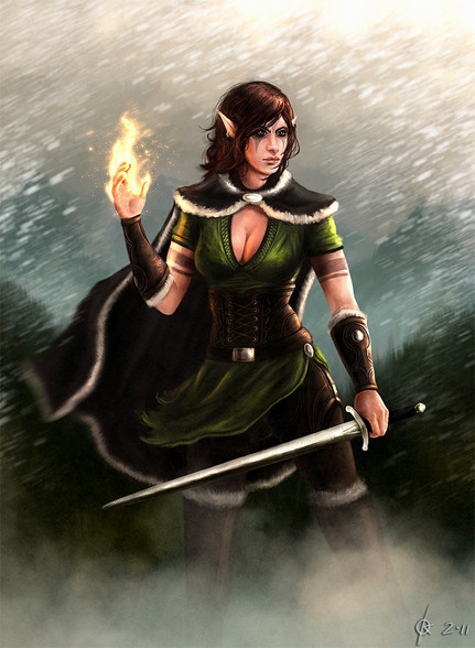 I've had some characters on skyrim before this one, for example a warrior khajiit and a wood elf archer. But I like this one best. She's wearing Elven Armor in this picture. I was gonna draw the helmet, but you could barely see her face to I've drawn a circlet instead