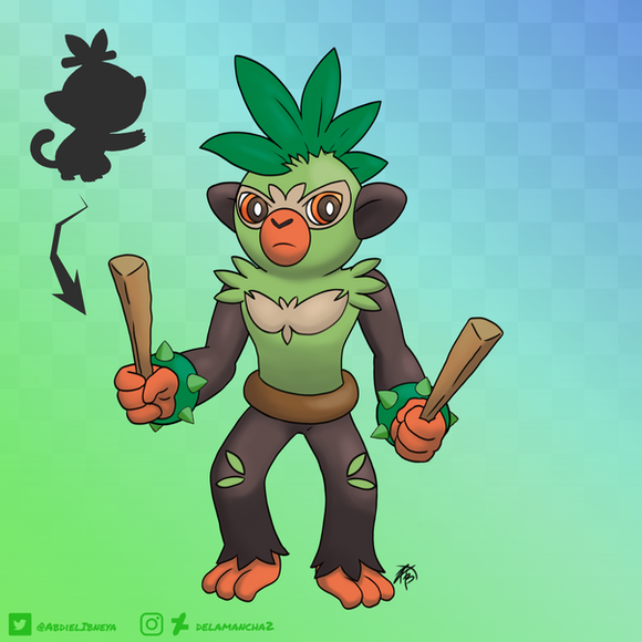 The Grass/Rock typing would be fun. And unique for a Grass starter so no complaints there. Or it could be a Grass/Steel heavy metal monkey. Or a Grass/Electric one.