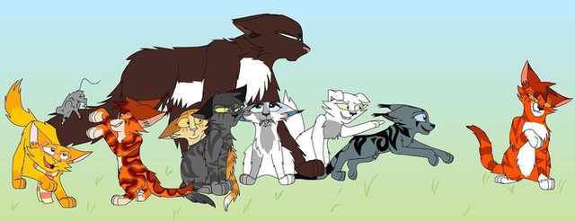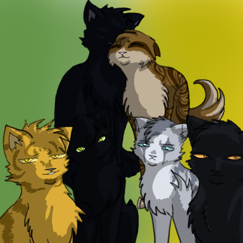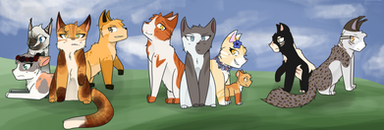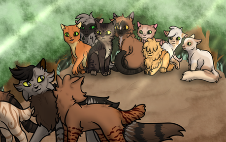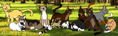 Characters from left to right: Scorchstar, Morningkit, Brokenpaw, Rosepaw, Fireflame, Sneezetalon, Shadekit, Maplestep, Meadowkit, and Frostpaw.Scorchstar is the leader of my clan, Lightning Clan. Fireflame and Sneezetalon are the parents of Brokenpaw, Rosepaw and Frostpaw. Maplestep is the mother of Meadowkit, Shadekit and Morningkit and her mate is Timberfall, not in the picture. Rosepaw has just returned from her running away after Grassfang died. Frostpaw's not happy because of something Rosepaw said to him before she ran away.