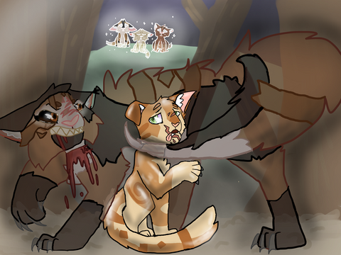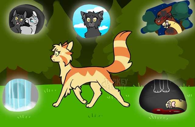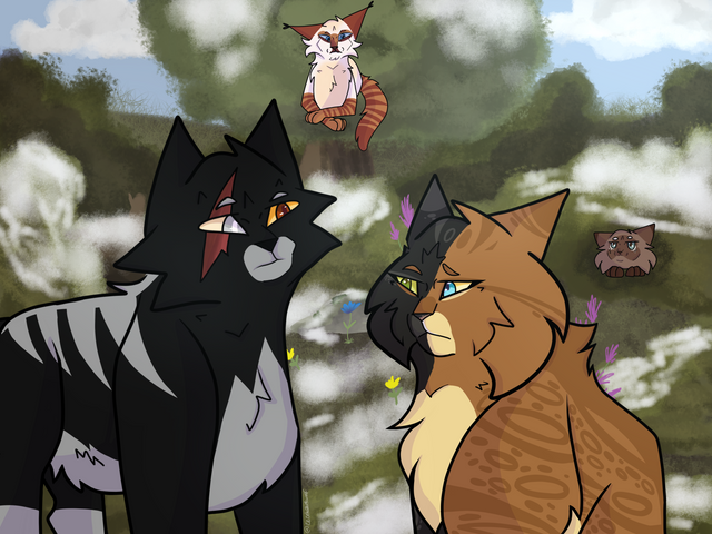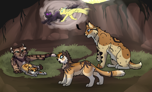 Fanart from heyits-hardy's comic Dying EmbersCharacters from Left to Right: Mudbranch, transparent cream, black, white and brown she-cat, Fernwatch, one-eyed cream tom, Tawnysky. ginger and brown tabby she-cat, Dewflight, transparent brown and white she-cat, Sunkit, transparent brown she-cat