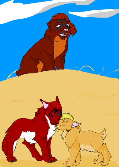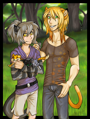Characters from left to right: Tora(multi-orange, black and white tom) Tsuki(black she-cat), Rama(orange and dark orange tom-kit), and Mayuko(sandy tabby she-cat)Cat version because original forms? What's that?