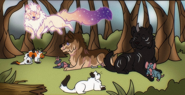 My babies are lookin' a bit ragid because Rosepaw fell into a river, Tora jumped into said river to save said 'paw, Ushio almost had a heart attack, and Mayuko and Asako were woken when the two wet cats and slightly panicked tom entered the den. The reason Rosepaw ended up in the river was because Grassfang died, from both the chill in the air and old age, and she fled the clan because no one was as close to the elder as she was. RIP Grassfang.