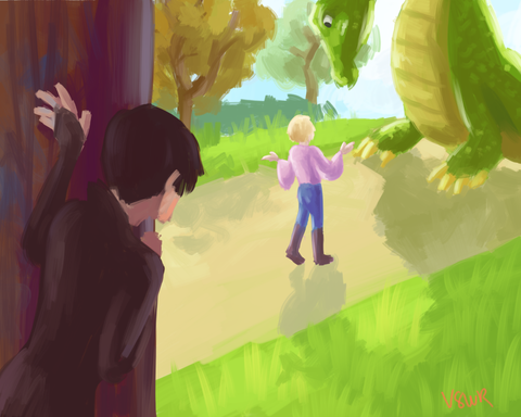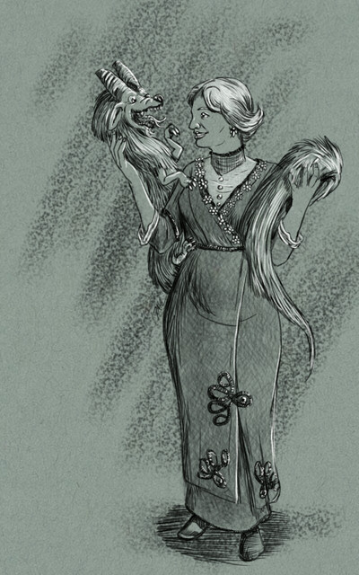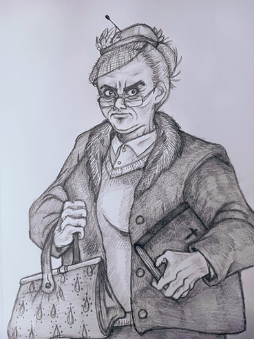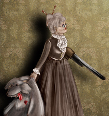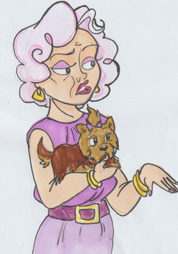 Terrible background, tried to go for a comic style. The dog is an alien who decided he liked the crusty old lady because she's mean and he likes evil. Think Lilo and Stitch the sandwich alien, but with being okay with being a dog an old lady dotes on as she harasses as much of the world as she can.Original Story, side characters.