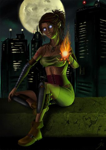 I so love how everything glows! It's incredible. His ears are expressive, and definitely accentuate his facial expression. The detail on his bow and knives are brain-numbing. A little critique: Some of the lines are a little too hard, like on the orange feather where the center shaft looks slightly like an attack from Paint. The edges of the feather, where the lines are thinner and smoother are excellent; I'd love to see more of this in your future works. Oh, and the top of his noggin: I can see where the hair hits the edge of his skull in a thick line. Perhaps try to use the curve of hair to denote the back of his head instead of a solid line. Otherwise, awesome! *Has to play catchup now*