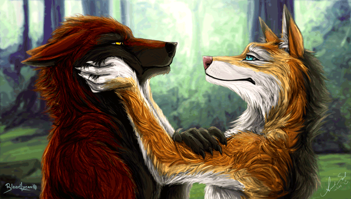 Oh my god, I love wolves and I think this picture has made me love them even more. The male's eyes are so beautiful, so... powerful. I love the small earrings, I've seen them in other drawings and never really understood them but it's a very nice touch.