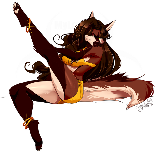 The pose and expression on this character are wonderful, fits together really well. Fantastic work making the lines so sharp and smooth, the colors look great here, and are given nice depth by the shading. The feet look really really well done (and that's normally something people have trouble with), and the kinda half on/off outfit is very alluring. Awesome work on this one WolfRoxy.