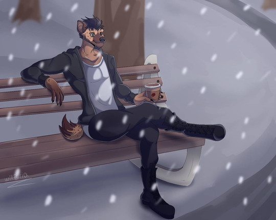 Great job on the snow effects, the background looks great, good posing on the character, excellent detail, color, and lines as always. Great job on this WolfRoxy.