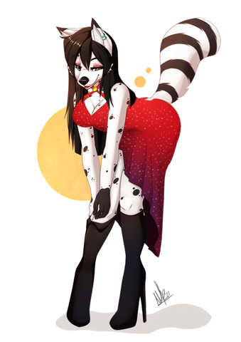 Interesting outfit, I like how the bright white outfit contrasts with the red background, great colors, lighting and detail; the character is also has a very interesting outfit, and is well complemented by the lighting and color effects.