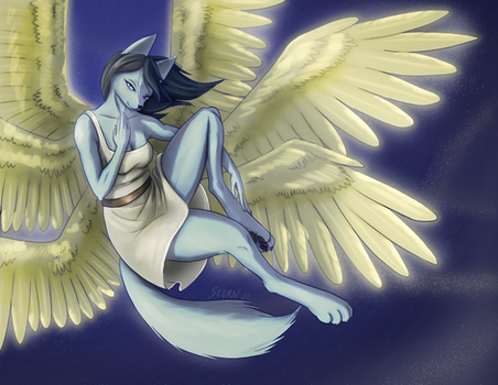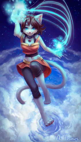 Love all the varying shades of blue on the character, and also the blueish "glow" halo around the character. The outfit is an interesting choice, very Greek and/or priestess looking.