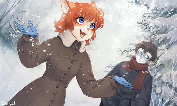 Character looks cute as always, I've always liked the unique way you make eyes/irises, fantastic color, lovely snow effect in the background, great lines, costume, and detail as well.