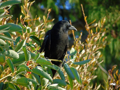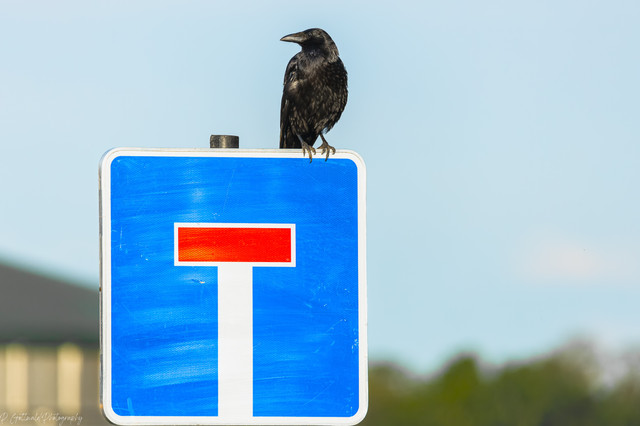 A crow sitting on the local city direction sign.I always think of the one from Mash :>