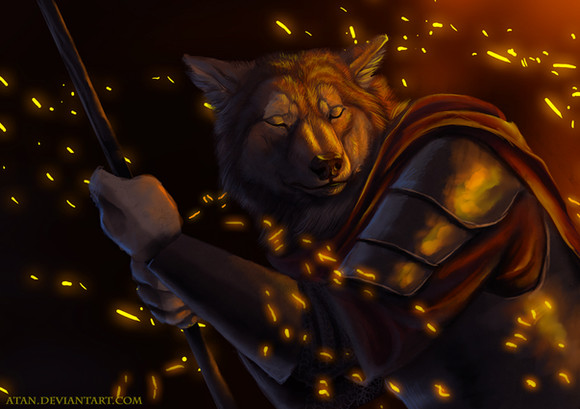 This is pretty good, especially the inscription on the armour but I don't see the need for the wolf aura if it's already.. a... wolf. It seems unnecessary, and the gauntlet seems a little off. Other than that it's awesome