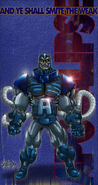 lol looks like the terminator .. its kewl I like the colour, and the upper body size... but the costume (shoulders/arms) is a little bit off not a big problem, its just I would have preferred seeing some bigger beefier legs too... in comparison with the rest of him he looks like he's standing on twigs that couldn't hold up his chest but despite those things I like lots of other things about this one... the lighting, the colour, etc... its mostly good