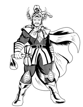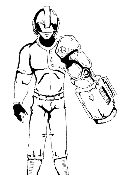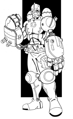 i can honestly say this was not meant to be so cool. i just wanted to draw a guy with a huge robot foot and a big glove arm. then it took on a life of its own. he already had a mask on when i started the pic, but it was not until i drew a spur on his robot leg that the idea of a cowboy hero with robot parts took over. made a western style shirt and some fringe to the glove and a gun holdter and boom. western hero.