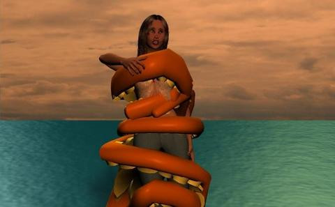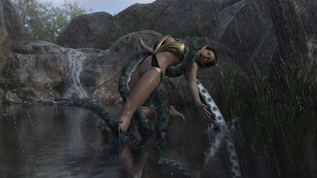 Here is 's latest work for me of Rangersque in battle with a octopus, getting grabbed, and losing her weapon. If she can't reach it she's pretty much defenseless.Related content