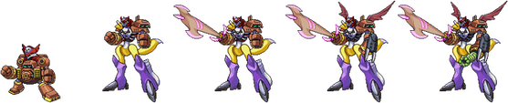 I'm currently in the process of recolouring sprite sheets in preparation for a load of Xros sprites. One of the Digimon is an Aurumon that becomes a Ravemon.I've decided to make all 24 Xros Digimon I've chosen have three stages. For the first stage of Aurumon's line I've chosen Hawkmon; I removed the feather on his head and recoloured him.
