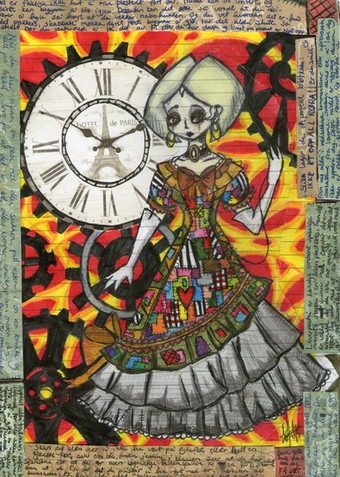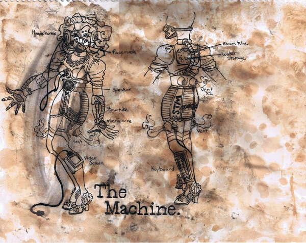 Another "Period Robot" with dress based on common 1840's women's clothing.Watercolor and ink and metallic ink.