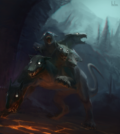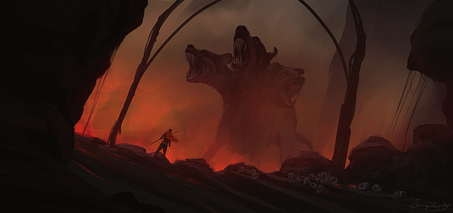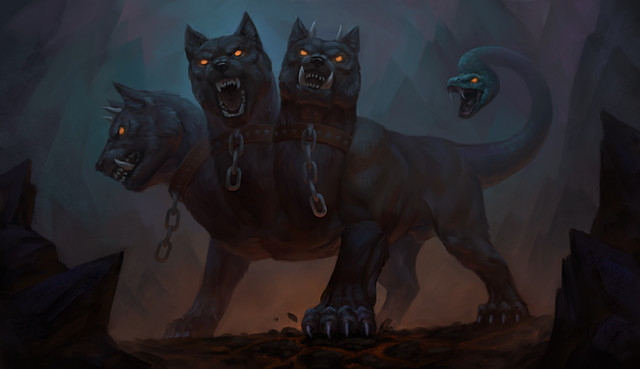 I like the different expressions of the Cerberus heads. The contrast of color is nice.