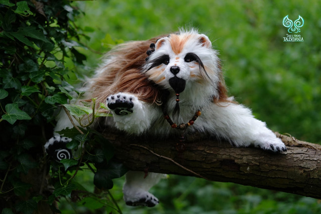 Materials: polymer clay, eyes-glass, acrylic, lacquer,wire, faux fur, leather cord for amulet. Filler - padding polyester, glass granules.