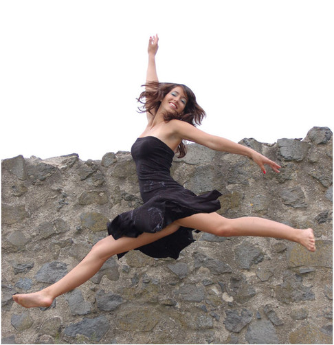 is she jumping on a fallen wall ? looks like pavement or sumthin'