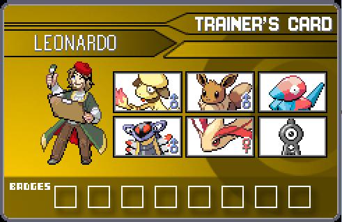 Well basic trainer information is name, money, pokedex (amount seen) and badge count.