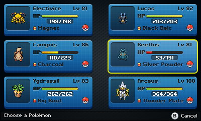 The party menu, this will open up with a secondary key, which is separate from the previous menu. This is used for quick at a glance party info from a single key, rather than opening the menu and then selecting the pokemon option. Statuses such as poisoned or burned, will have an icon appearing just like the classic screen.This is subject to change