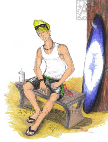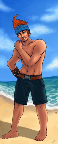 I love the coloring O.O Especially the background! The water looks perfect to just jump in on a hot day! The pose looks great! His eyes are really blue, the water in the background brings them out nicely The neclace and the whistle have a nice flow to them, showing movement. The whole picture looks fantastic! awesome job!