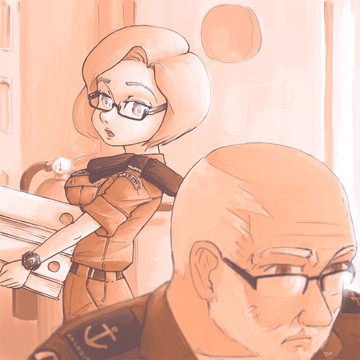 Venturi is the helmsman. I picture this as being her first proper posting as a commissioned officer (so her snotty cruise not withstanding). She's probably on a tactical stream so, per the description, she's helming in the place of a rating... hence why her seat is also at the centre of the view-screen bowl, so she gets the least distortion off it. As for the other two: 'Stache is the boat's commander and Grandpa is the flight engineer.