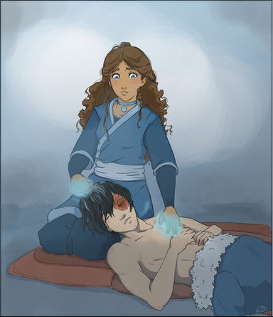 The glow on Katara\'s hand and the lighting are amazing! The expressions in this are also wonderful and like said, Aang looks just so sad that I think I want to hug him. As always, wonderful job!