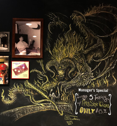 I made this last month at my local Domino's around Skyrim's anniverseryGreat story...my first attempt at this a child got hold of the chalk and scribbled the shit out of the entire bottom half with every color (it was still a work in progress) so I had to redo it. I came back after I finished it to get my pay and some shitty teenager smudged a smiley face over Alduin's head and wiped their hand all over the bottom half. Luckily I got this picture before that happened. It turned out as one of my favorites