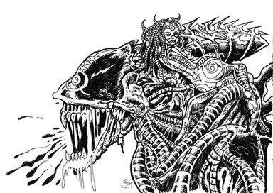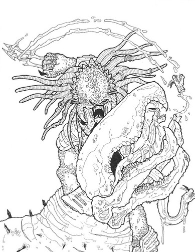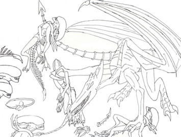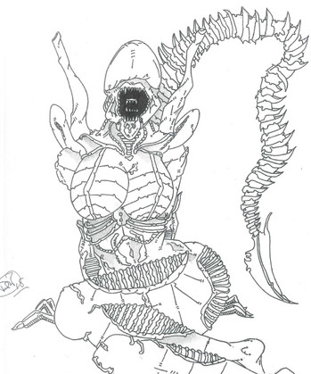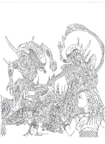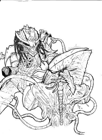The Predator clan have successfully captured the Queen, but relentlessly escaped their clutches. It is up to the female Predator to tame her.Her right leg is a bit disproportionate, but this one turned out well, I think. (created April 2011)