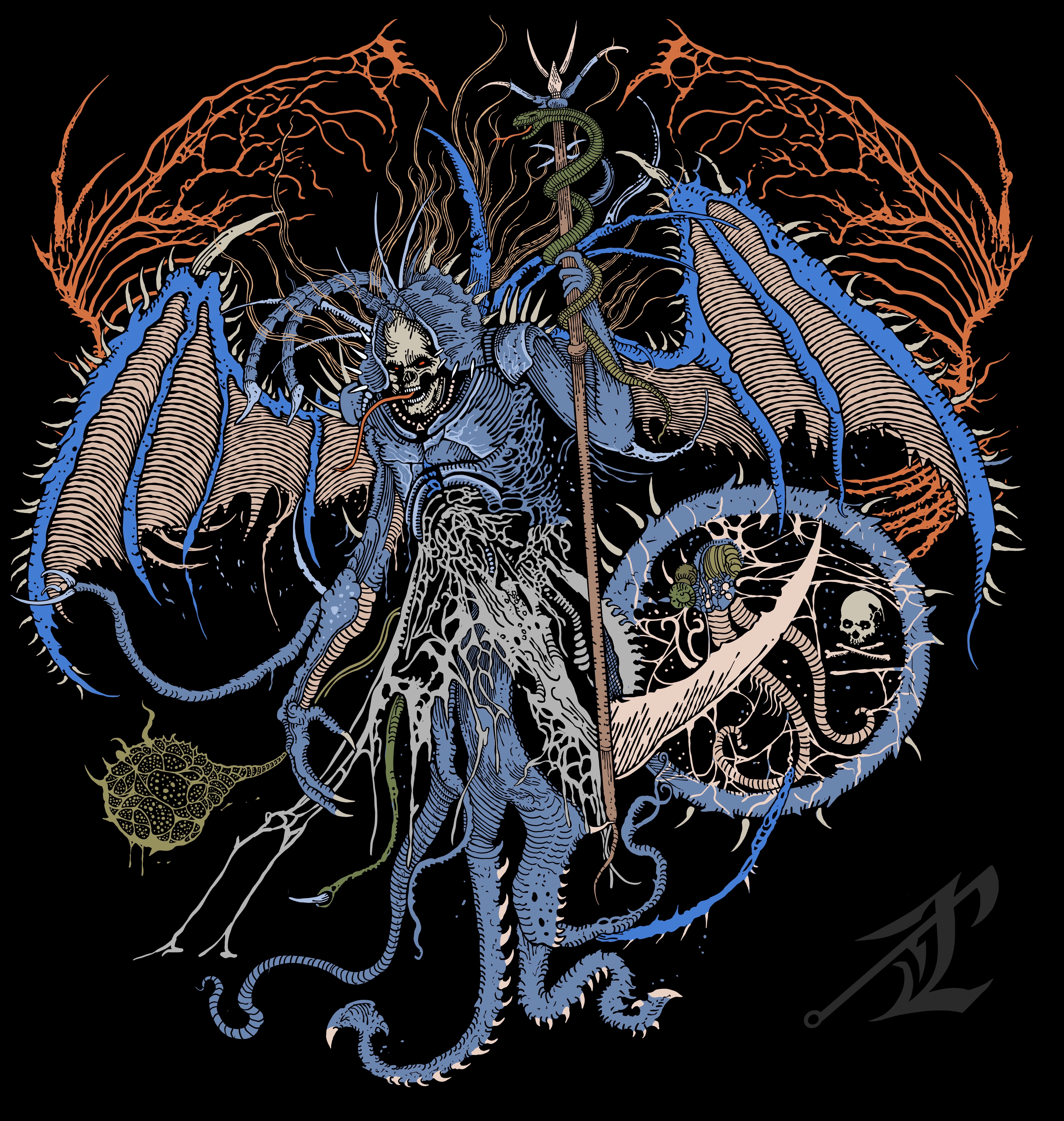 Another potential t shirt design. I'm really trying to nail down a good style for Death metal/ Deathcore and Black Metal aesthetic. Mostly trying to get creepier and more aggressive silhouettes out of this style as well as work on skeletons and bones, which is something I've been neglecting for some time.Related content