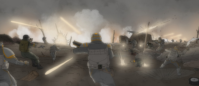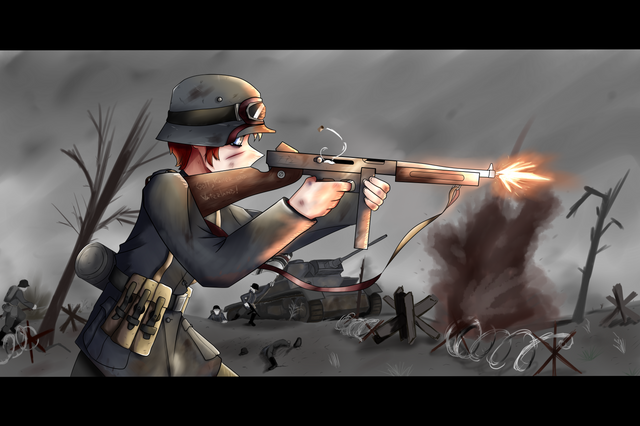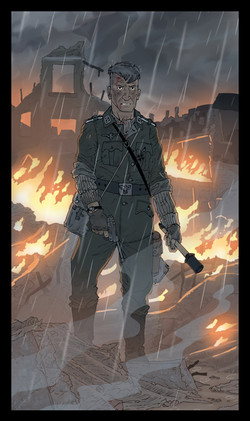 I took an image frame from the Call of Duty: Infinite Warfare trailer and used that as my starting point. I wasn't aiming too hard for historical accuracy. Which is also why everyone seems to be using tracer rounds XD. I doubt that's historically accurate, but I chose it for dramatic flare. That said, I did a lot of image gathering on the German army uniforms and weapons, so hopefully that's passable. Also, this location is fictional. I didn't base it off of any specific place.