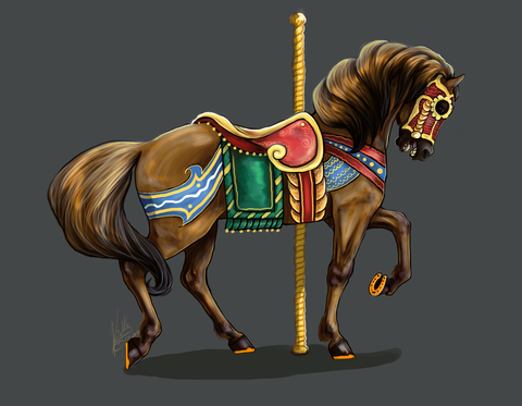 Oh wow! I think the shading is wonderful! You did a really excellent job making him look like a horse made of wood, not a real horse with a pole through it (like mine look ). Much less grotesque, haha. I really love how you drew the face, as well, and the mane/tail. They're very carousel-y. The tack is beautiful, too! Thank you so much for making this!