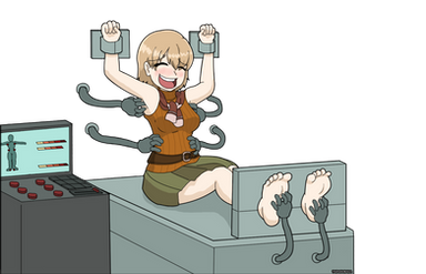 All of the small details around the feet/body impress me.Β Lots of subtle shading and color changes.Β The small strokes around the archs of the right foot, for example, and inside the center of both feet.Β Those same effects work really well on her left leg, giving it debth, but around her thighs/crotch is where I think its utilized best.Β It's a very, very well drawn piece.Β I didn't recognize it for Samus at first, and it almost seems slightly out of character, but, well.Β I would also imagine it would take this level of bondage and tickling to really get her laughing haha.Β There's just so much attention to her feet alone, and then all of the brushes .Β Speaking of attention to her feet, I'm glad that the way the hands are tickling her is as intricate as it is.Β Those hands feel really life like in their approach.Β Kudos.