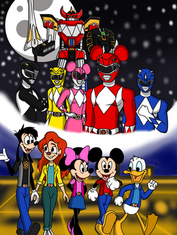 Time for another Chip 'N Dale Rescue Rangers/Power Rangers crossover pic. This time, the Rescue Rangers meet the original team, the Mighty Morphin Power Rangers! I decided to recreate the look of the Rescue Rangers show while giving the Power Rangers the feel like they're in a cartoon crossover special. Guess a team of small heroes would require a big team of heroes. Chip, Dale, Gadget, Zipper and Monterey Jack would definitely need help from Jason, Billy, Zack, Trini, and Kimberly in this mission. When there's no case too big, no case too small, it's morphin time!Chip 'N Dale: Rescue Rangers © Disney