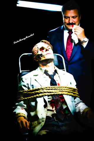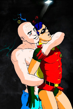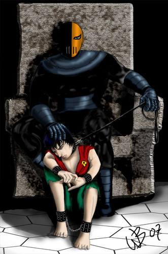 Oh wow! They have their masks on and what an effect with the masks! The way Slade's mask reflects off of Robin's and it doesn't show his eye but instead just that black outline which makes it look so scary and wonderfully Slade-like! Not to mention the hand, the bare hand, caressing Robin's face and being so deceptivly gentle even though you can see the tears running down from Robin's eyes! Great picture; you're getting better with every one!