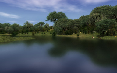 Add more transparency to the water and cover the terrain with grass and different tones of greens and browns.